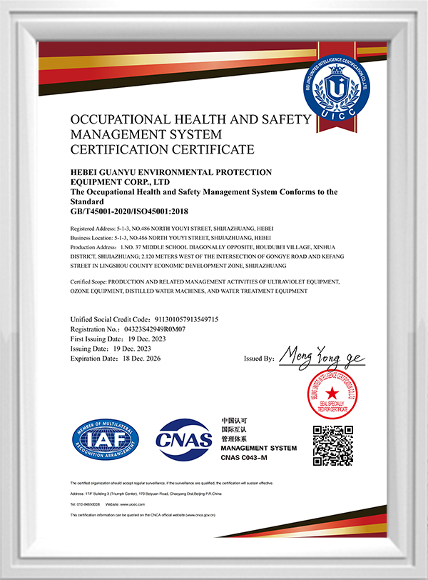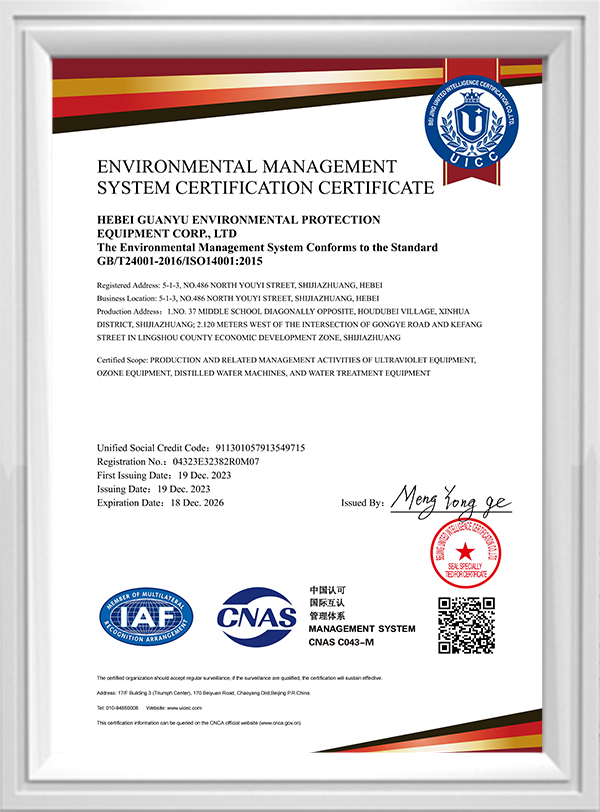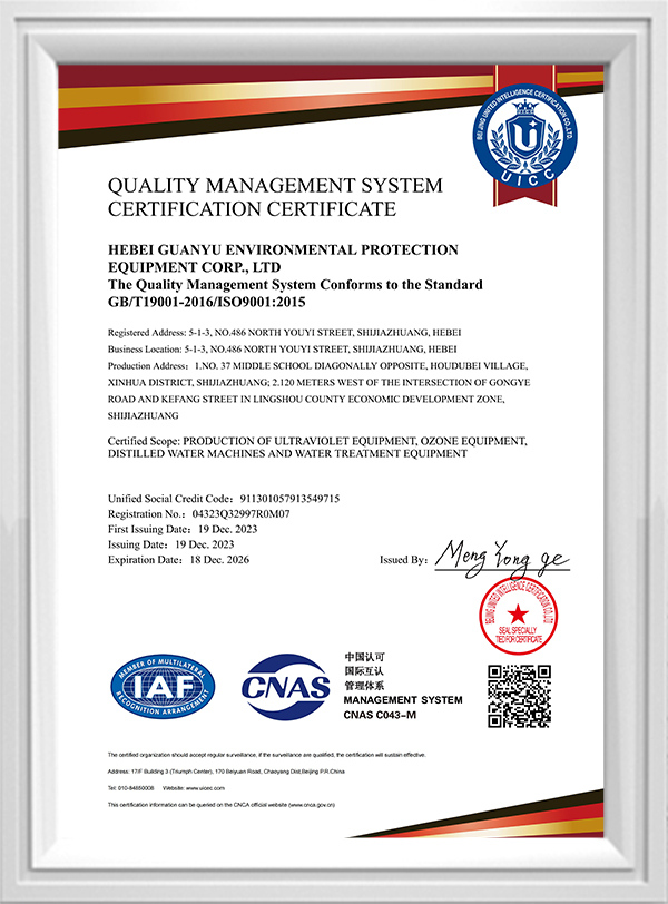 We are a professional manufacturer and engineering company specializing in ozone disinfection equipment, ultraviolet disinfection equipment, pharmaceutical equipment, multi effect distilled water machines, medium pressure ultraviolet disinfectors, AOT photocatalytic sterilizers, AOP water purification equipment, filtration equipment, water treatment disinfection and purification equipment, etc. The company has 10 utility model patents and 1 invention patent, and its products passed the ISO9001 quality management system certification in 2012.