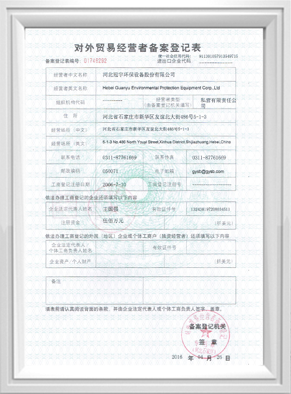 Hebei Guanyu Environmental Protection Equipment Co., Ltd. is a high-tech enterprise specializing in the research and development of water treatment technology and environmental protection equipment. It is a national high-tech enterprise, a technology-based enterprise, a technology small giant enterprise, an innovative enterprise, a specialized, refined, distinctive and innovative enterprise, a large-scale enterprise, and a listed company, integrating production and manufacturing, technology research and development, engineering design and construction, and import and export trade. Equity code: 660171. The company was established in 2006, with its headquarters located in Shijiazhuang City, Hebei Province.